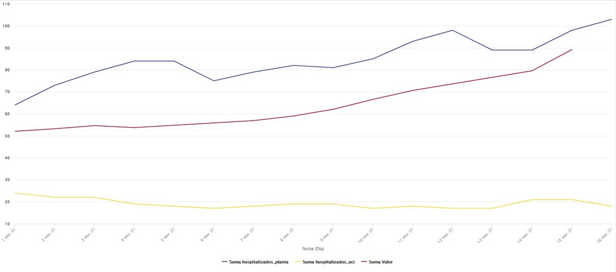 La incidencia acumulada a 14 días en Castilla y León ha crecido un 178 por ciento en el último mes, de la tasa de 32 casos por cada 100.000 habitantes notificada el pasado 15 de octubre a los 89 de este martes, 16 de noviembre; mientras que la cifra de pacientes ingresados en hospitales ha crecido un 81 por ciento, de 68 a 123.
