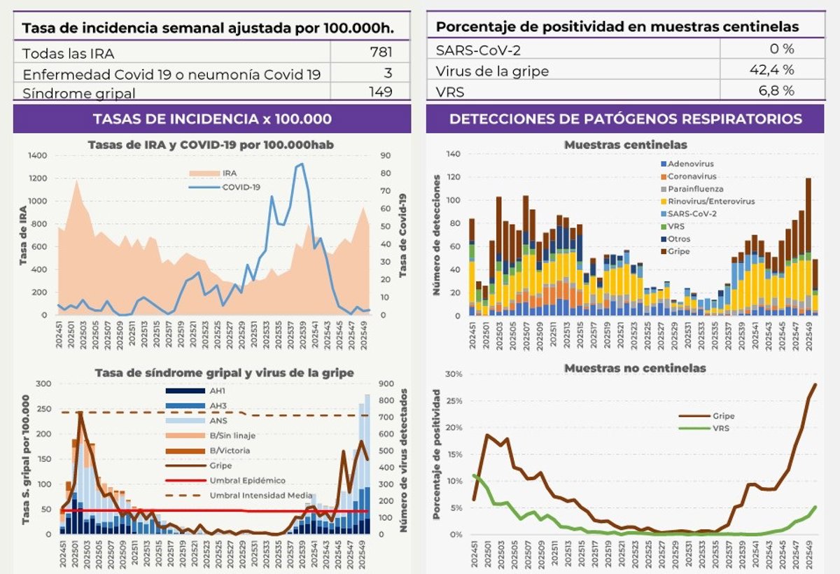Según refleja el último informe del programa de Vigilancia de las Infecciones Respiratorias Agudas (Vigira) durante la semana 50 --del 8 al 14 de diciembre-- la tasa global de incidencia de las IRA se sitúa en los 781 casos por 100.000 habitantes, por los 893 del anterior periodo.