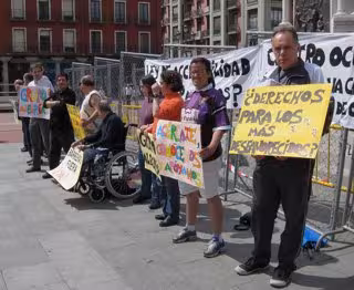 Una decena de usuarios del centro de atención a personas con discapacidad psíquica Grupo Alegría, encabezados por su responsable, Charo Zarzuela, han reclamado este jueves en la Plaza Mayor de Valladolid a la Junta de Castilla y León que admita su conversión a centro ocupacional para que puedan optar a subvenciones públicas.