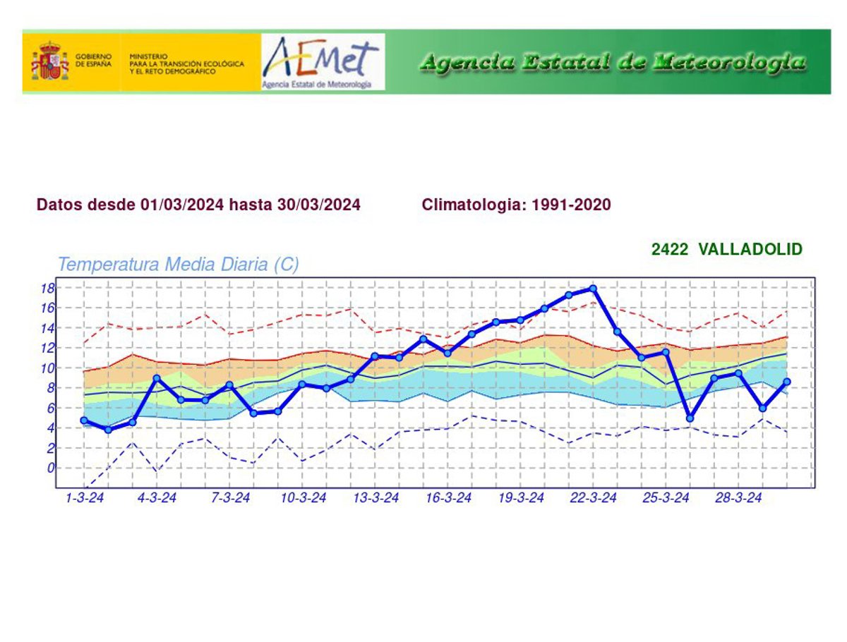 Gráfico elaborado por la Aemet sobre la temperatura media diaria registrada en Valladolid en el mes de marzo - @AEMET_CYL