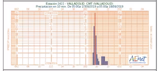 En concreto y según los datos ofrecidos por la Aemet, Valladolid registró un récord histórico en intensidad de precipitación con 20,2 litros por metro cuadrado en 10 minutos (121,2 litros/metros cuadrados de intensidad).