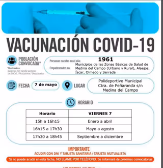 La vacunación para esa misma edad en Medina del Campo será el viernes 7 de mayo en el polideportivo municipal y están convocados los empadronados en los municipios de las Zonas Básicas de Salud de Medina del Campo (Urbano y Rural), Alaejos, Íscar, Olmedo y Serrada en horario de tarde, de 15:00 a 18:45 horas en franjas de una hora y quince minutos para cada mes de nacimiento.