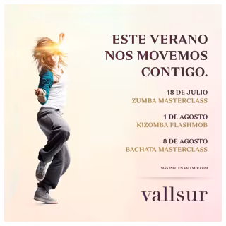 El centro comercial Vallsur ofrece a sus clientes numerosas actividades gratuitas para disfrutar durante el verano y así este sábado ha programado una Masterclass de Zumba el próximo, una Flashmob de Kizomba el 1 de agosto, y una Masterclass de Bachata el día 8 de agosto.