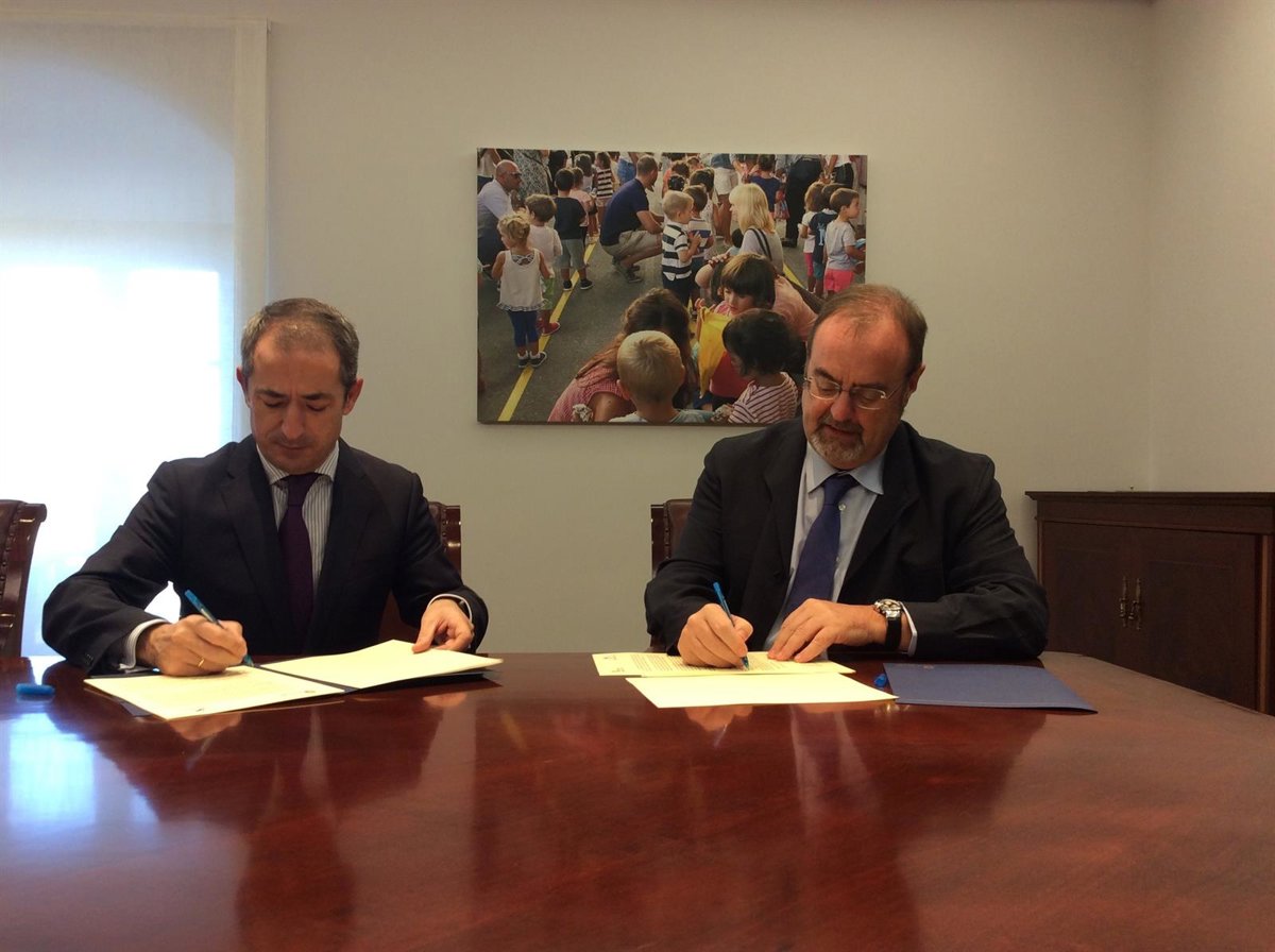 El consejero de Educación, Fernando Rey, y el director territorial de Caixabank en Castilla y León y Asturias, José Manuel Bilbao, han firmado este miércoles un convenio para la implantación del programa 'Jóvenes Emprendedores' en centros docentes sostenidos con fondos públicos.
