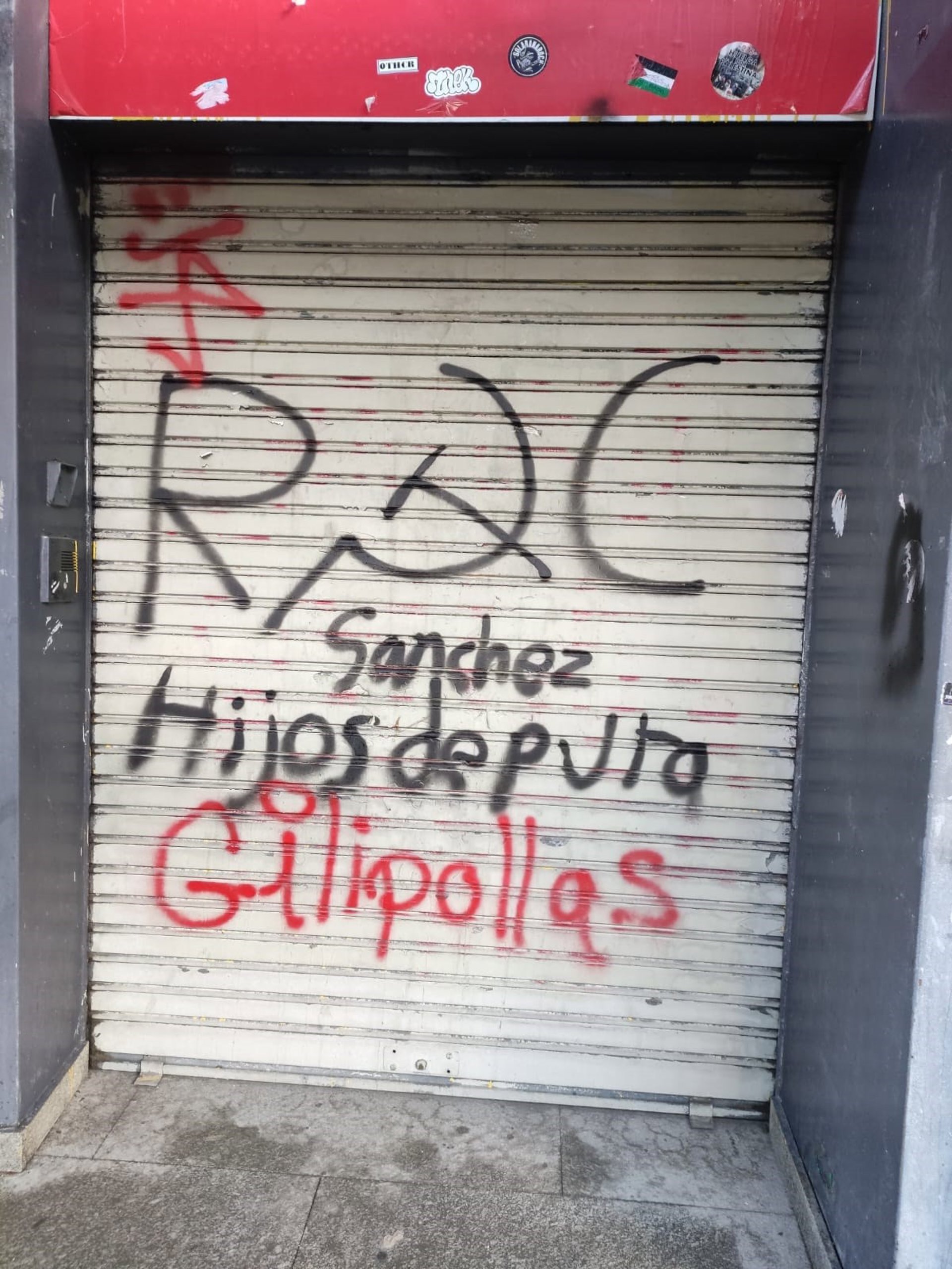 La sede del PSOE de Burgos ha amanecido este lunes con pintadas e insultos en las persianas metálicas de su sede de la calle Vitoria 105, descalificativos como "vendeobreros", "vendepatrias" y "traidores", además de otras ofensas hacia el presidente del Gobierno, Pedro Sánchez.