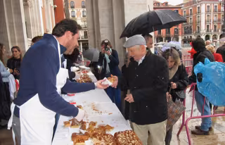 Varios cientos de vallisoletanos han acudido en la tarde de este martes, pese a la lluvia que ha caído, a la Plaza Mayor de la ciudad para poder degustar la Corona de San Pedro, elaborada por la Asociación Provincial de Empresarios de Confitería para celebrar las fiestas en honor al patrón de Valladolid.