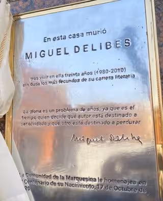 La placa recuerda que los 30 años que residió el escritor vallisoletano en este inmueble fueron "sin duda los más fecundos de su carrera literaria" y muestran una cita de una frase de Delibes: "La gloria es n problema de años, ya que es el tiempo quien decide qué autor está destinado a ser olvidado y qué otro está destinado a perdurar".