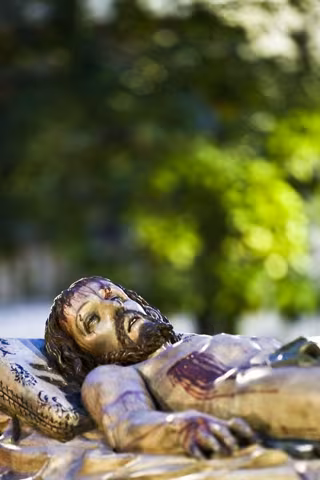 La Cofradía del Santo Entierro alumbrará su paso titular 'Cristo Yacente', del imaginero castellano Gregorio Fernández, que partirá a las 21.45 horas del Monasterio de San Joaquin y Santa Ana.