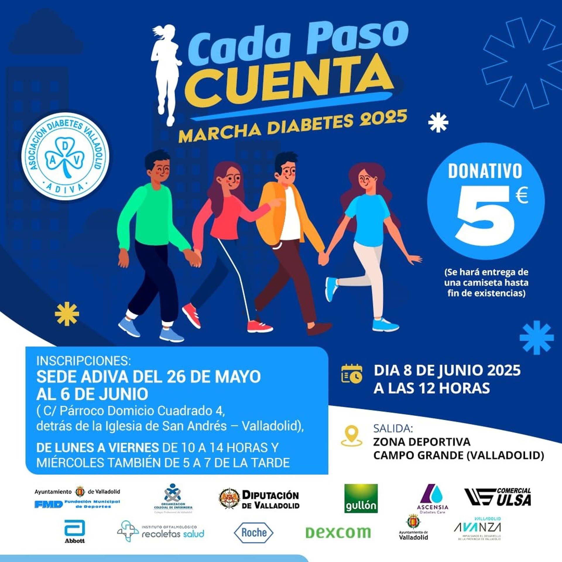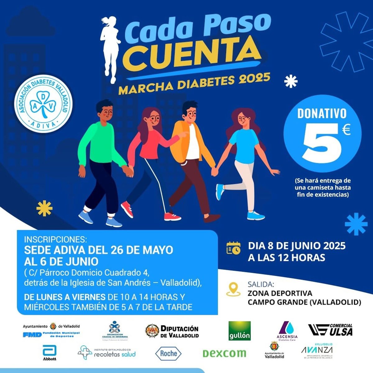 Este evento solidario cuenta con la colaboración del Ayuntamiento de Valladolid, la Diputación Provincial, Valladolid Avanza, Fundación Municipal de Deportes, Policía Municipal, Protección Civil, Colegio de Enfermería, Instituto Oftalmológico Recoletas Salud, Abbott, Dexcom, Coca Cola y Galletas Gullón.