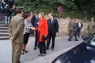 Doña Letizia ha llegado al centro alrededor de las 11.00 horas vestida con chaqueta roja y pantalón, zapatos de tacón y bolso de mano negros para mantener un encuentro con autoridades y responsables de la academia en la Sala de Juntas de la Academia.