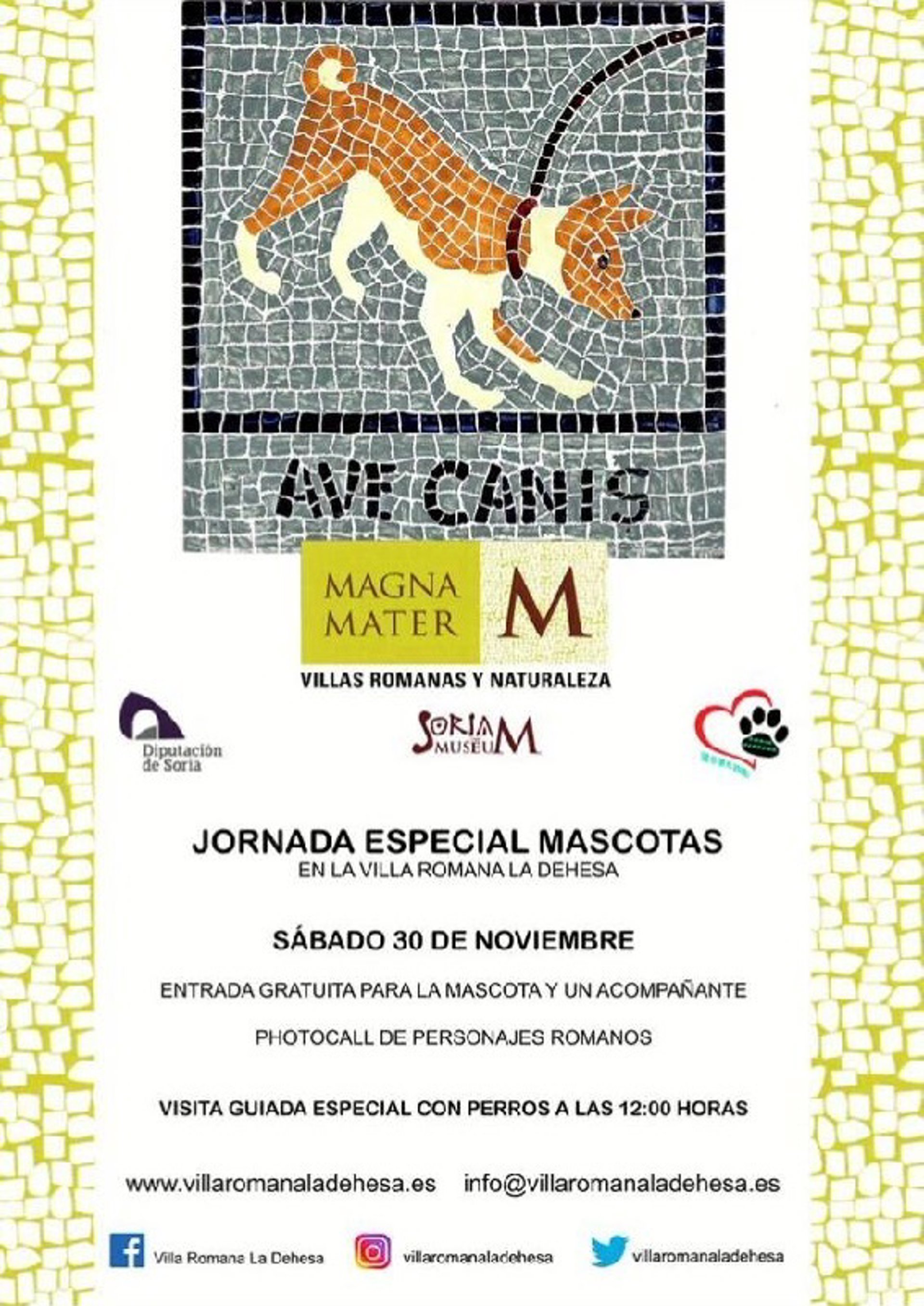 La Asociación Soria Perruna ha llegado a un acuerdo con la Diputación Provincial y con Soria Museum para que la visita a la villa romana La Dehesa sea gratuita el 30 de noviembre para todas aquellas personas que vayan acompañadas por un perro.
