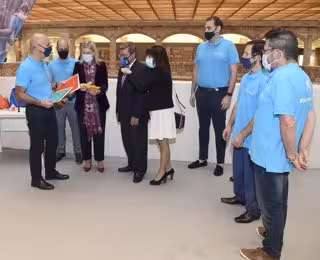 El presidente de la Diputación de Burgos, César Rico, junto a la directora territorial de CaixaBank en Castilla y León, Belén Martín, junto a voluntarios de la campaña Vuelta al cole 2021. - LA CAIXA.