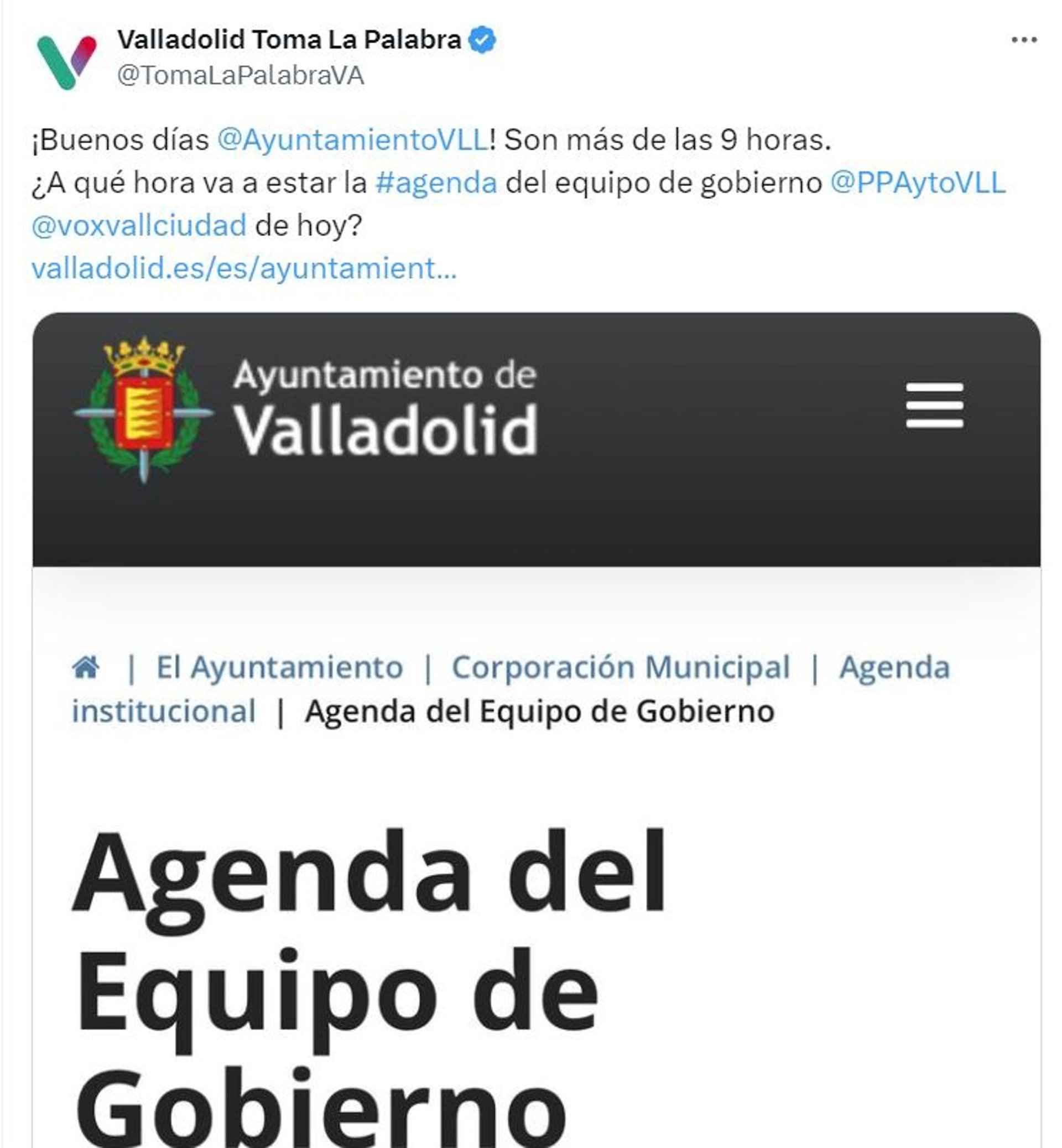 El Grupo Municipal de Valladolid Toma la Palabra ha criticado este miércoles en la red social 'X' el retraso en la publicación de la agenda institucional del equipo de Gobierno, que en el caso de hoy no se ha subido a la web municipal hasta pasadas las 9.00 horas, cuando hasta hace unos meses estaba disponible a primera hora de la jornada precedente.