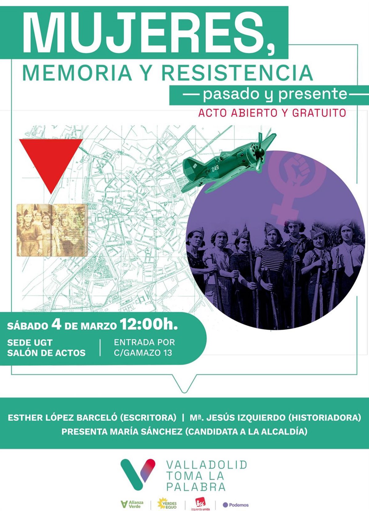 La encargada de conducir el evento es la candidata a la alcaldía de Valladolid Toma la Palabra, María Sánchez, e intervendrán la historiadora María Jesús Izquierdo y la escritora Esther López Barceló.