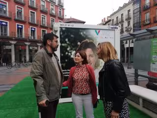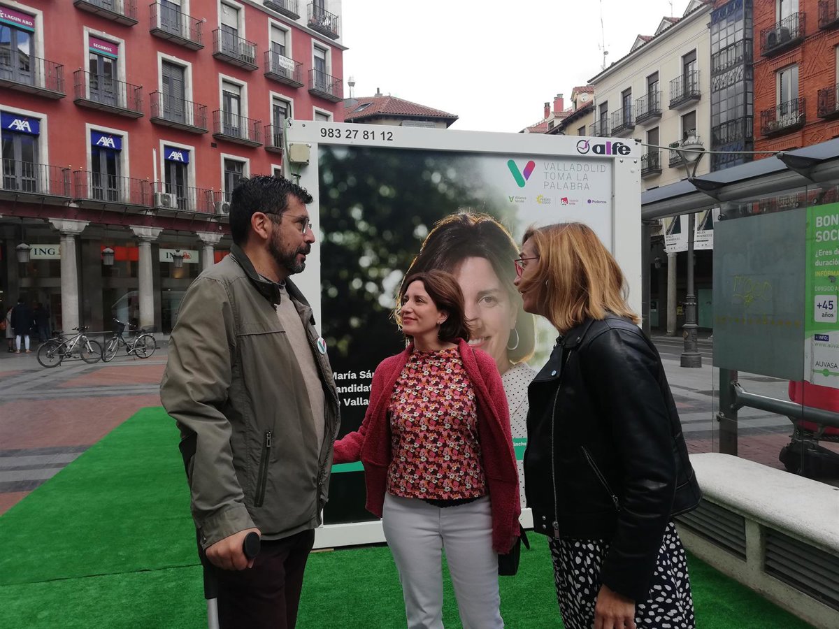 La candidata de VTLP a la Alcaldía de Valladolid, María Sánchez, con Alberto Bustos y Rocía Anguita conversan ante la caseta electoral - EUROPA PRESS