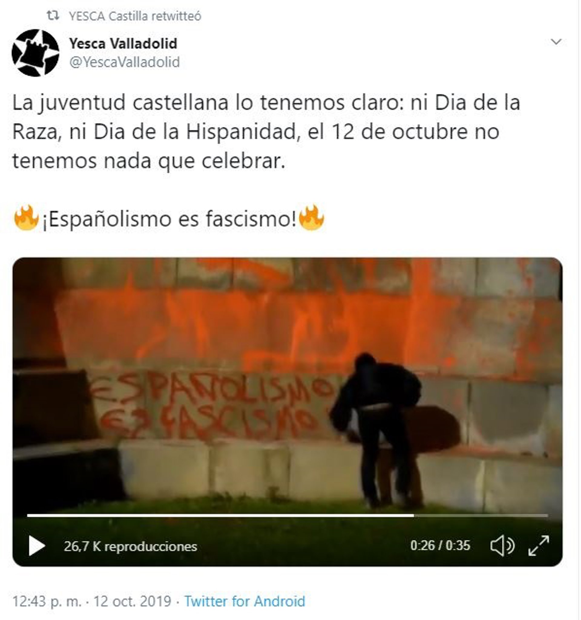 Junto al vídeo, las Juventudes Castellanas Revolucionarias han lanzado también el siguiente mensaje: "La juventud castellana lo tenemos claro: ni Día de la Raza, ni Día de la Hispanidad, el 12 de octubre no tenemos nada que celebrar. ¡Españolismo es fascismo!".