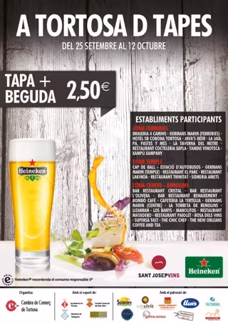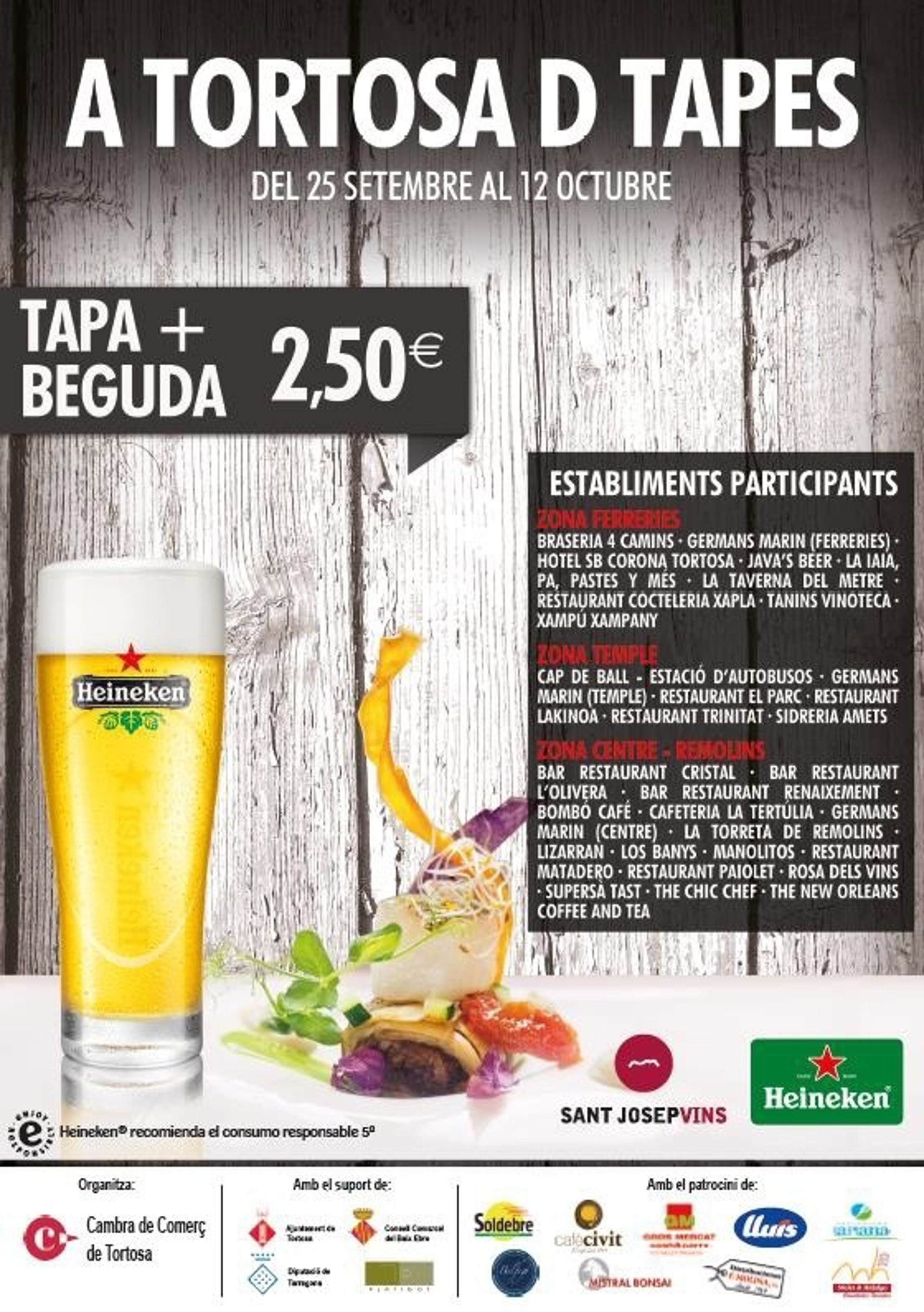 Un total de 31 restaurantes, bares y cafeterías de Tortosa se han adherido a la iniciativa 'En Tortosa de Tapas', que se celebrará entre el 25 de septiembre y el 12 de octubre ofreciendo una tapa con una bebida por dos euros y medio.