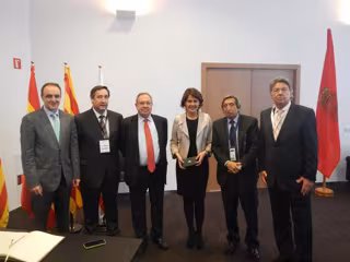 La presidenta del Gobierno de Navarra, Yolanda Barcina, ha visitado este martes la feria Alimentaria, donde ha firmado en el libro de honor junto con el conseller de Agricultura de la Generalitat, Josep Maria Pelegrí; el director gerente del Instituto Navarro de Tecnologías e Infraestructuras Agroalimentarias (Intia), José Mari Echeverría; el consejero de Desarrollo Rural, José Javier Esparza, y el presidente de Fira de Barcelona, José Luis Bonet.