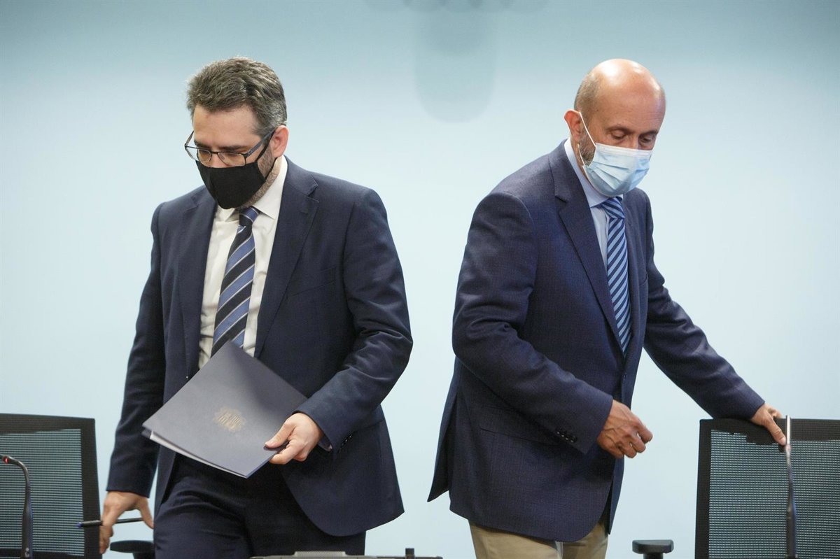 El ministro Portavoz, Eric Jover, y de Salud, Joan Martínez Benazet, llegando a la sala de prensa del Edificio Administrativo del Gobierno - SFGA / CESTEVE