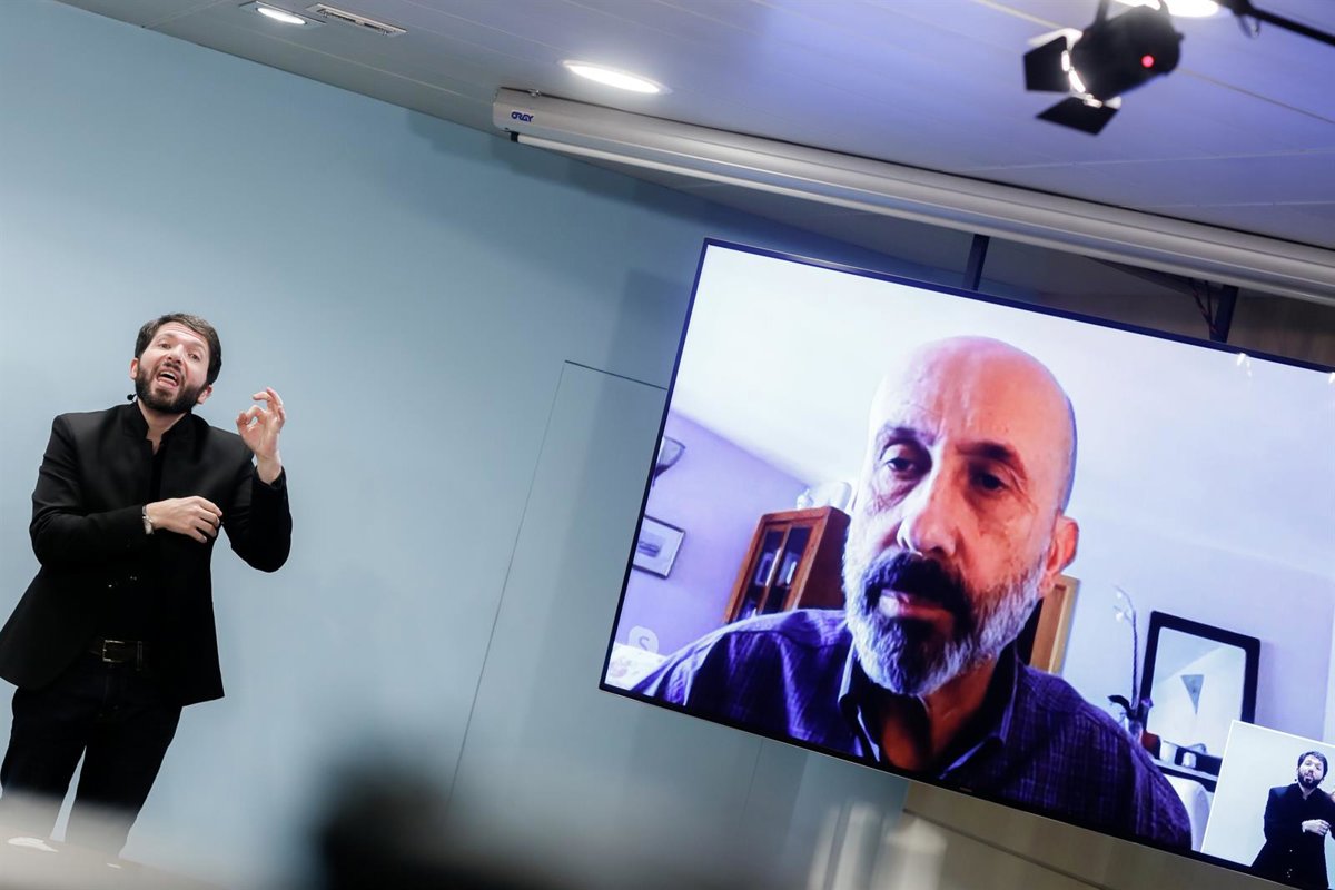 El Intérprete Del Lenguage De Los Signos, David Jiménez, Y El Ministro De Salud, Joan Martínez Benazet, En La Pantalla, Durante La Comparecencia Del Viernes. - SFGA / CESTEVE