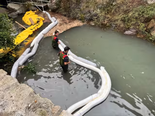 Los bomberos instalando barreras para frenar el vertido de gasóleo - BOMBERS D'ANDORRA