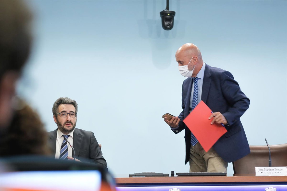 El ministro portavoz, Eric Jover, continúa la rueda de prensa mientras el ministro de Salud, Joan Martínez Benazet, se prepara para abandonar la sala - SFG