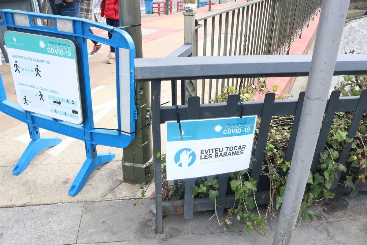 Unos carteles en Andorra recuerdan la obligación de mantener las distancias de seguridad, circular por la derecha y evitar el contacto con el mobiliario urbano para reducir el riesgo de contagio por Covid-19. - EUROPA PRESS
