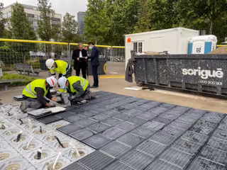 El Ayuntamiento de Barcelona y el grupo Sorigué han presentado este miércoles un pavimento solar que genera energía eléctrica, en una prueba piloto de 50 metros cuadrados de pavimento generador fotovoltaico que tendrá una potencia de nueve kilovatios.