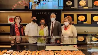 La directora general de Endesa en Catalunya, Isabel Buesa; los propietarios de La Pastisseria Barcelona; el primer teniente de alcalde, Jaume Collboni, y la concejal de Comercio, Montserrat Ballarín. - EUROPA PRESS