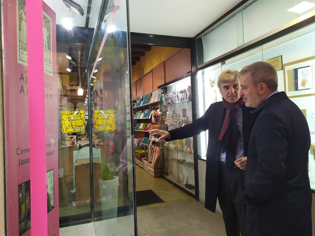 Uno de los impulsores de la iniciativa 'Aparadors Artístics', Flix Riera, y el primer teniente de alcalde del Ayuntamiento de Barcelona, Jaume Collboni, observando uno de los escaparates participantes. - EUROPA PRESS