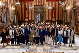 El alcalde de Barcelona, Jaume Collboni, junto con los asistentes a la presentación del nuevo 'Pla Estratgic' este martes en el Ayuntamiento. - AYUNTAMIENTO DE BARCELONA