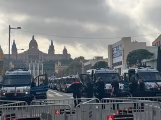 En las inmediaciones de la plaza Espanya de Barcelona, donde se encuentra la Fira de Barcelona, había un dispositivo policial creado por unos 20 furgones de la Brimo y del rea Regional de Recursos Operatius (Arro) de la policía catalana.