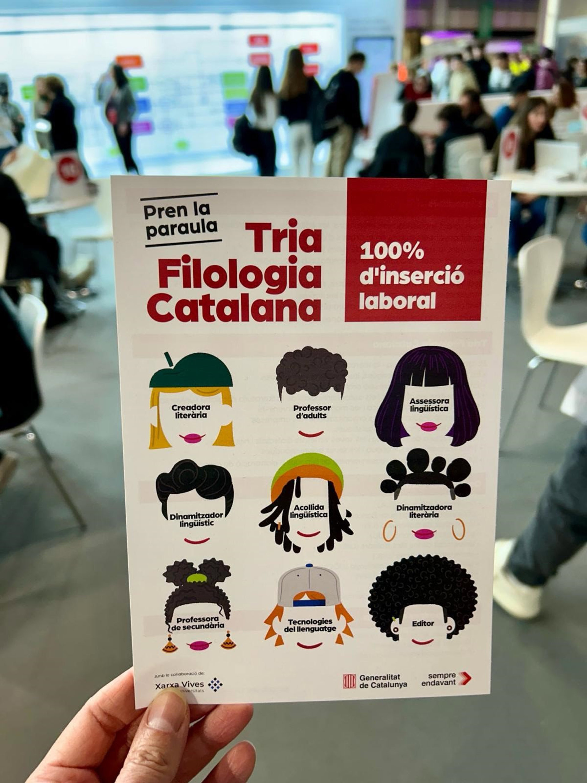 Con el eslogan 'Pren la paraula. Tria Filologia Catalana', la acción comunicativa señala la alta empleabilidad del grado y la multiplicidad de salidas profesionales que pueden hacerla atractiva para los alumnos de Bachillerato.