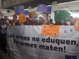 Ataviados con sombreros y silbatos, han desplegado una pancarta ante el expositor que rezaba 'Les armes no eduquen, les armes maten' (Las armas no educan, las armas matan) y han colocado flores, adhesivos y carteles contra su presencia en el salón, una acción que también ha despertado que algunos visitantes gritaran algún 'Viva España'.