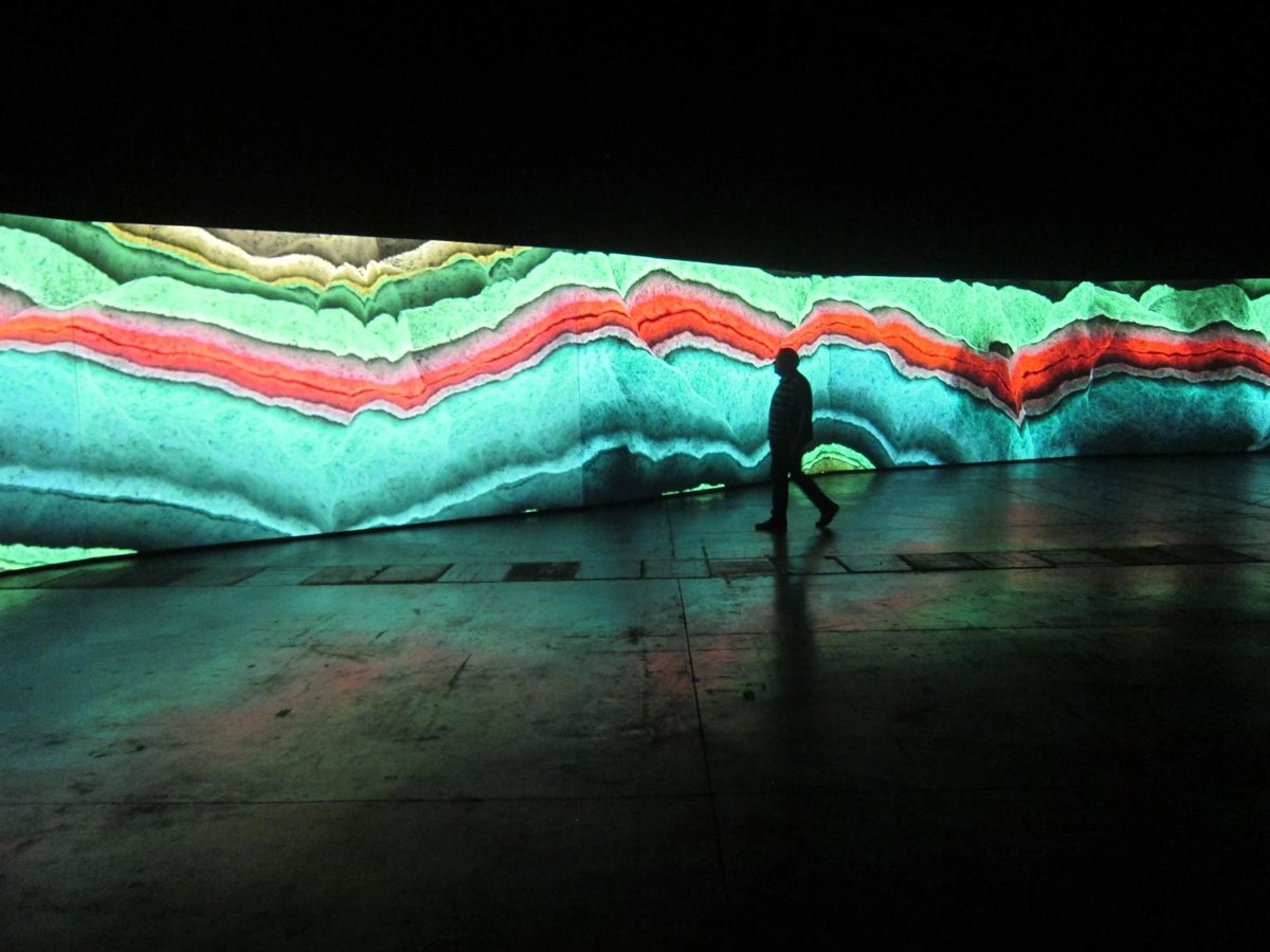 La obra de 5,5 metros longitud proyecta gráficos animados inspirados en los estratos de tierra del entorno de Planta, el complejo industrial de Sorigué, donde el grupo también ha enmarcado una colección y un proyecto artístico que le ha llevado a trabajar con Wim Wenders y Antonio López, entre otros.