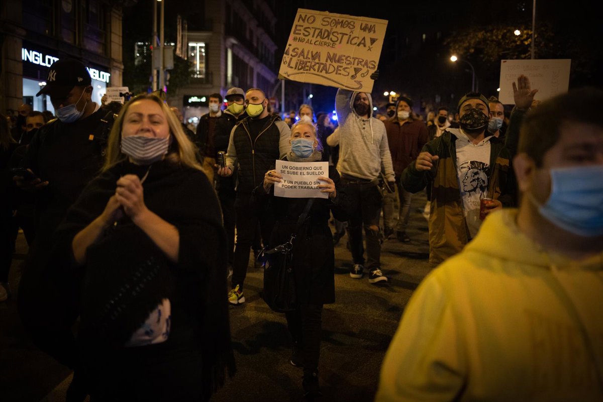 Los manifestantes, la mayoría con mascarillas, se han concentrado a las 18.00 horas en la plaza y un portavoz y propietario de el bar Los Olivos de Malgrat de Mar (Barcelona), Manolo Fernández, ha expresado con un megáfono su indignación con el cierre de la hostelería con el apoyo del resto de los manifestantes.