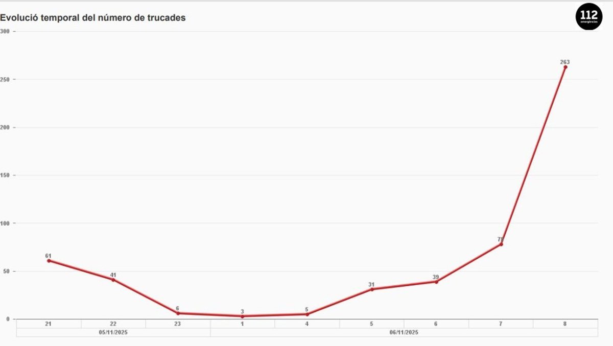 Hasta las 8 horas de este jueves, el 112 ha recibido 263 llamadas, hecho que supone que el 50% de las llamadas registradas hasta las 9.30 horas se han producido entre las 8 horas y las 9.30 horas.
