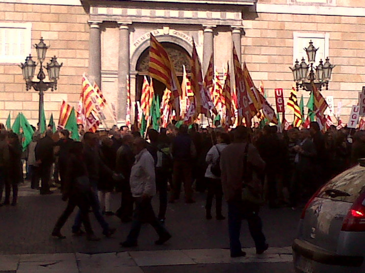Unos 150 delegados sindicales de UGT, CCOO y IAC se han concentrado este miércoles durante algo más de una hora ante el Palau de la Generalitat para protestar contra los recortes "indiscriminados" del Govern en el sector del empleo público, según ha informado la Guardia Urbana a Europa Press.