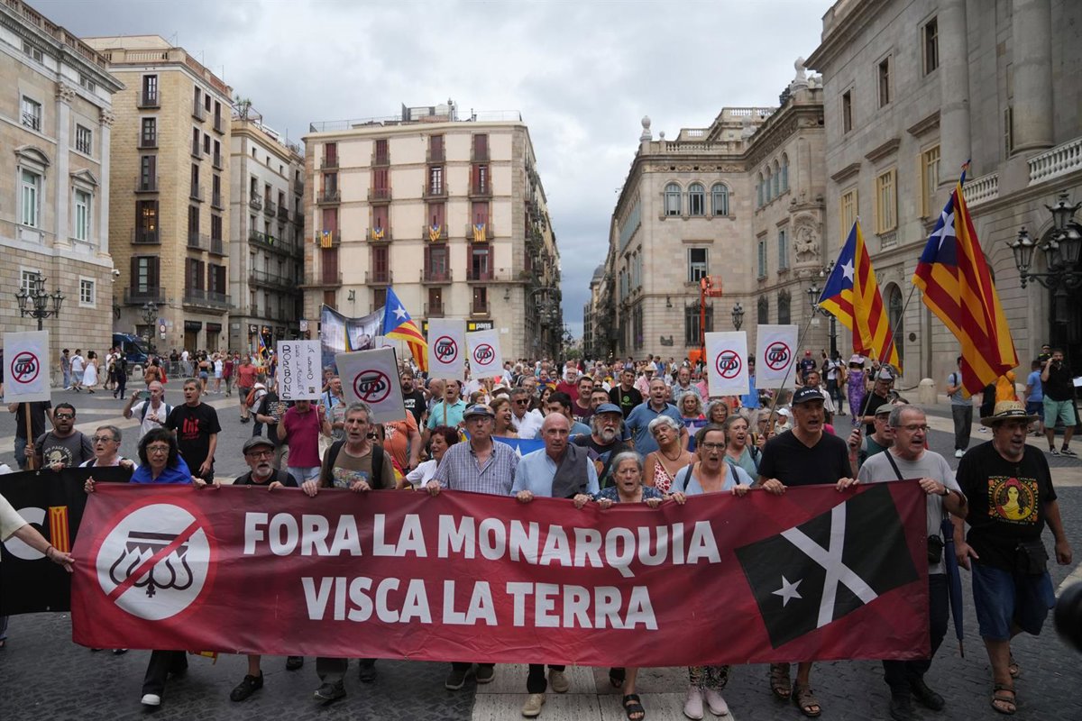 Unas 150 personas convocadas por la Assemblea Nacional Catalana (ANC) y la Coordinadora Antimonàrquica se manifiestan este miércoles en el centro de Barcelona contra la visita de los Reyes por los Premios Princesa de Girona 2025, que se entregan en el Gran Teatre del Liceu.