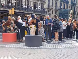 La ofrenda floral se ha realizado en el punto en el que se detuvo la furgoneta del ataque de La Rambla, en el que este jueves ya se depositaron flores, que se han apartado para hacer la ofrenda.