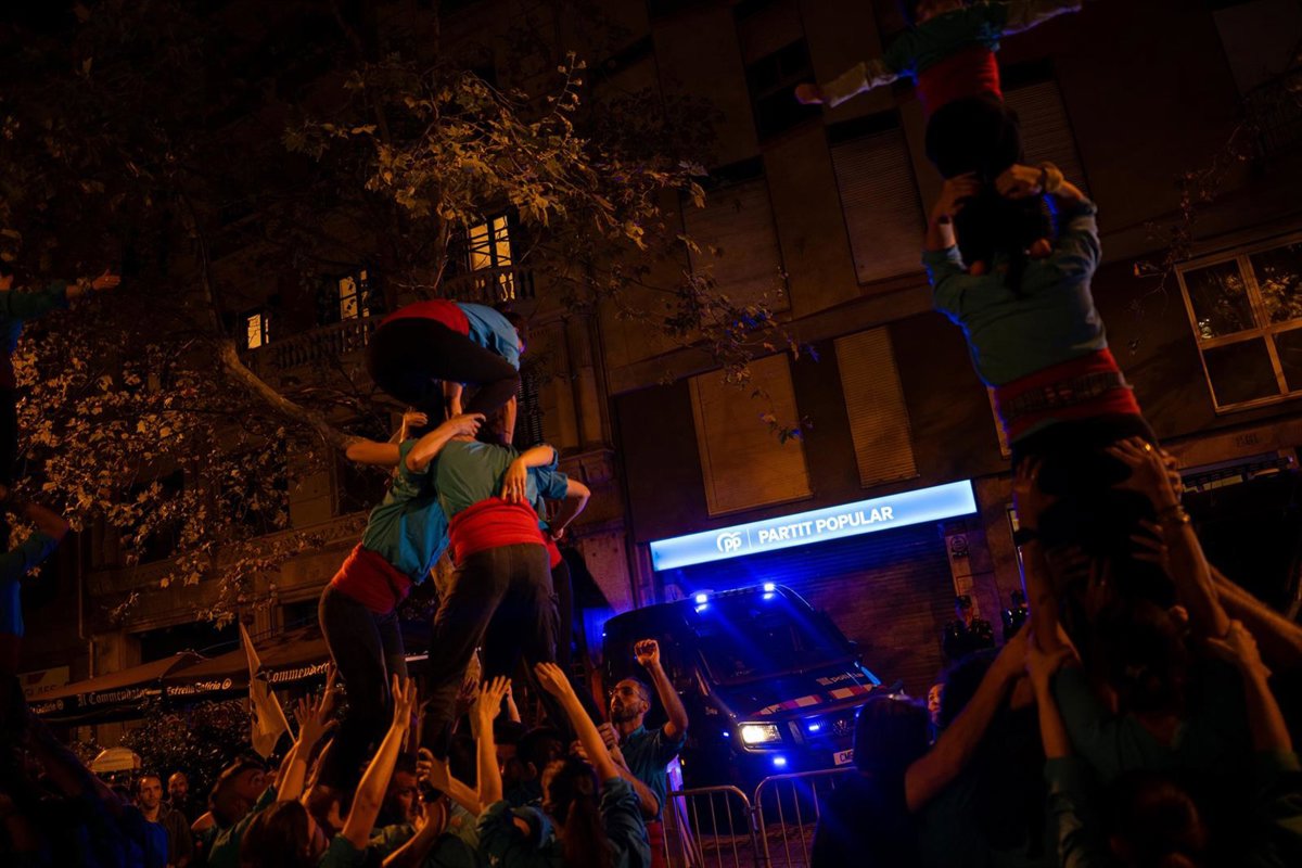 La Muixeranga de Barcelona ha levantado tres construcciones humanas y dos de los manifestantes han lanzado pintura contra la sede de los populares.