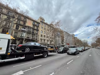 Los vehículos ocupan dos carriles dejando paso a autobuses, taxis, ambulancias y algunos turismos: preside la marcha una grúa con un vehículo de VTC encima, que lleva en las ventanas carteles con reclamaciones como 'No al decreTITO' --en referencia al portavoz de Élite Taxi-- y 'Así nos quieren ver en la AMB'.