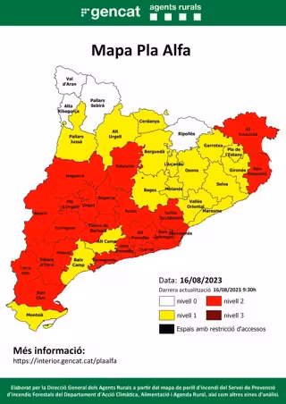 Agents Rurals tiene este miércoles 22 comarcas catalanas de Barcelona, Girona y, sobre todo, Lleida y Tarragona en el nivel 2 del Plan Alfa de peligro de incendio (que va de 0 a 3).