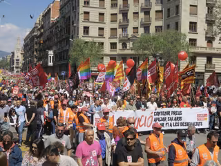 Unas 2.200 personas, según cifras de la Guardia Urbana, han participado este domingo a mediodía en Barcelona en la manifestación conjunta de CC.OO. y UGT de Catalunya por el Día de los Trabajadores, una cifra que asciende a 8.000 participantes según los dos sindicatos convocantes.