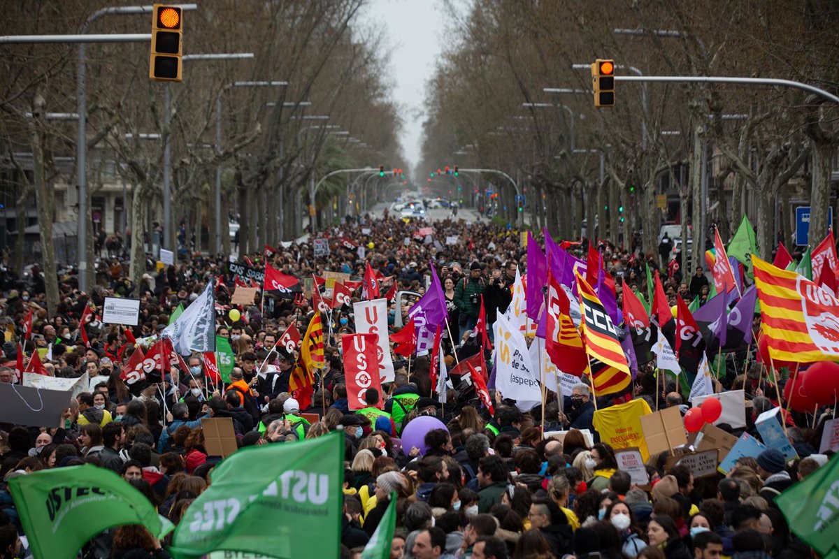 Manifestantes y miembros de los diferentes sindicatos sostienen banderas y pancartas en la manifestación durante el primer día de huelga educativa en Cataluña desde los Jardinets de Gracia, a 15 de marzo de 2022, en Barcelona - David Zorrakino - Europa Press