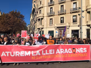 La manifestación ha empezado a las 12.15 ante la Conselleria de Economia, en la confluencia de la Gran Via con la Rambla de Catalunya, con la pancarta 'Paremos la Ley Aragonès' en primera línea, y la pancarta 'Se están vendiendo el país. Los servicios públicos no son un negocio' en segunda.