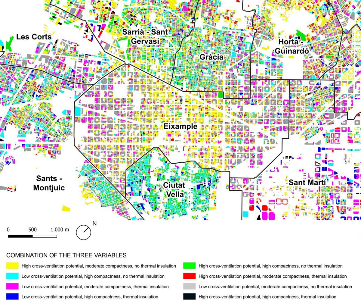 Según el investigador Carlos Alonso, los barrios antiguos con una elevada compacidad, como Ciutat Vella o Gràcia, "tienen un bajo potencial de ventilación cruzada, mientras que los edificios de la parte central del Eixample o las zonas cercanas a Collserola presentan mayor potencial de ventilación", lo que facilita la adaptación a situaciones de calor extremo.