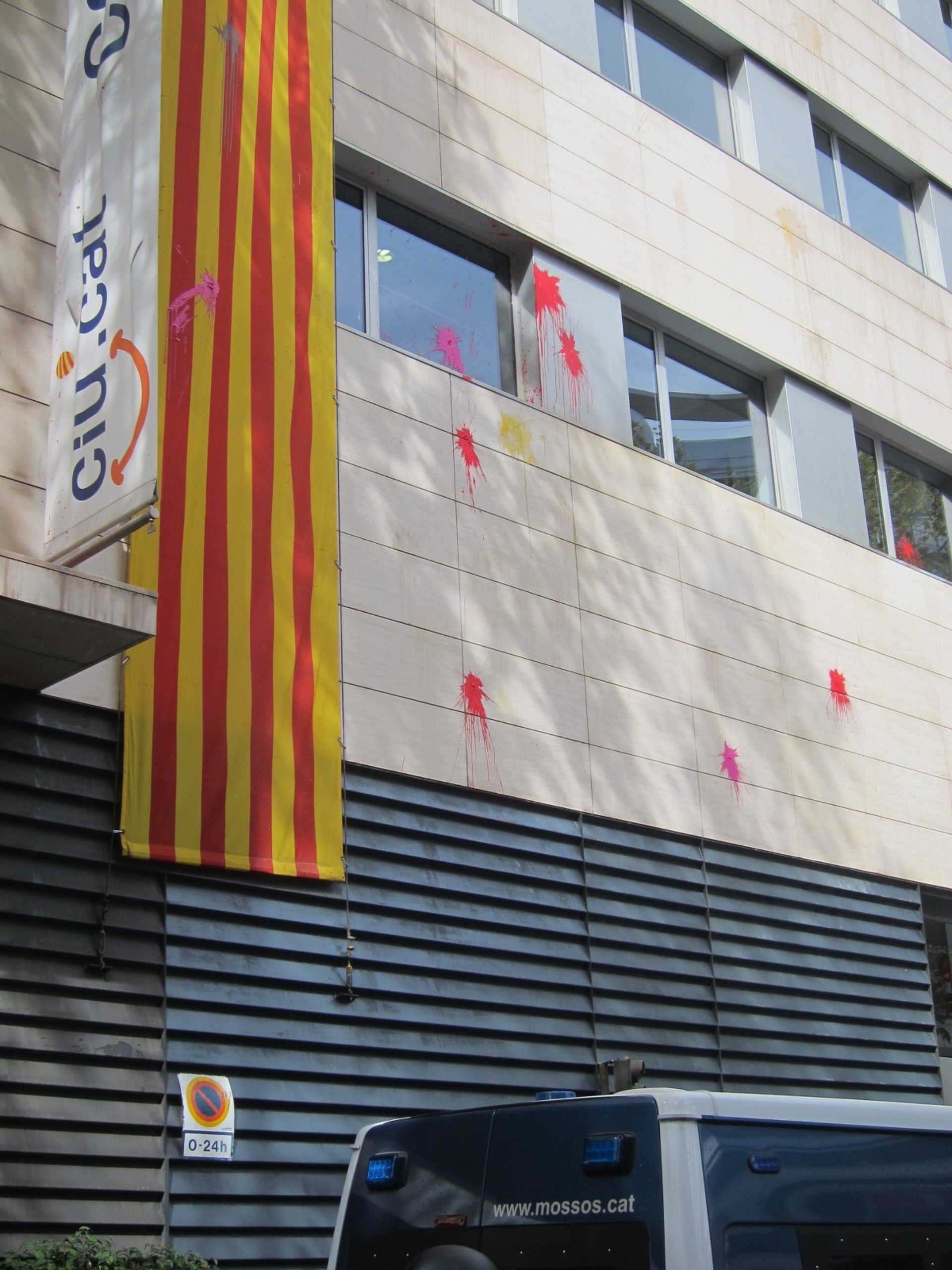 Contra ésta también han lanzado pintura blanca, y han torcido por Provença para llegar a la sede de CiU en la calle Córsega, donde les aguardaba un cordón de los Mossos d'Esquadra.