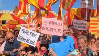 Otra de las pancartas hacía referencia al ingreso este viernes del FC Barcelona al Pacto Nacional por el Derecho a Decidir --diversos asistentes lucían camisetas de la selección española-- y también pedía que la celebración del 11 de septiembre sea más inclusiva: 'Diada y Barça de todos: fraude'.