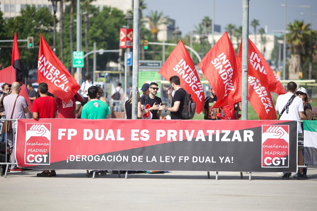 Una cuarentena de personas --convocadas por los sindicatos CGT, Ustec·Stes, la Intersindical y el Sindicat d'Estudiants-- se ha concentrado este viernes por la mañana ante el Palau de Pedralbes, donde se celebra la XXVIII Conferencia de Presidentes, para criticar que la formación profesional (FP) Dual "es una privatización" de la enseñanza.